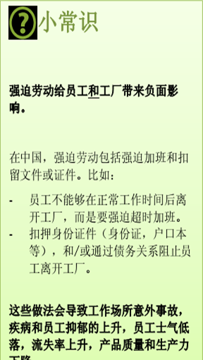 強迫勞動:根據國際勞工組織定義,強迫勞動是指“任何人員在受到任何形式處罰的威脅下,所提供的任何工作或服務,這些工作或服務是他/她本人不自愿從事的。”換句話說,強迫勞動是在不情愿的情況下從事的工作或者指如果拒絕工作或提供服務將會受到處罰的威脅。
