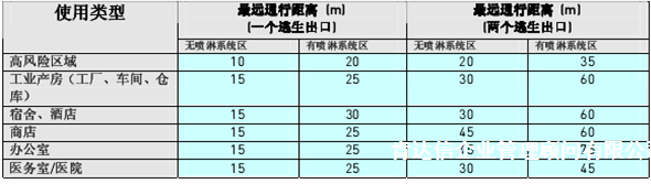 表2.3— 有或無(wú)噴淋區(qū)的通行距離和出口容量的限定