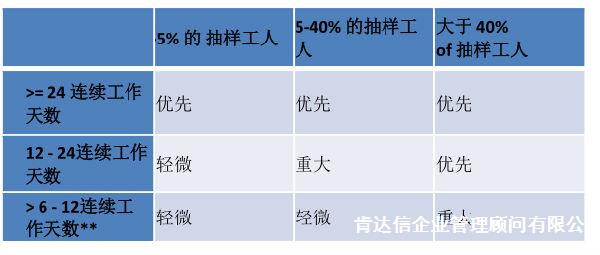 根據情形的程度和嚴重性來確定符合性。即:那些超過限度的工人的數量和比例以及超限程度。其
