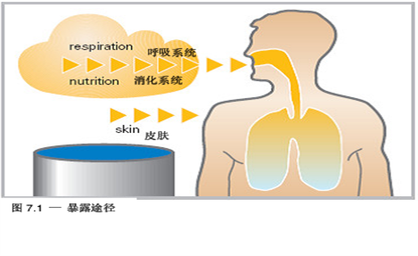在制鞋行業中化學品危害的基本途徑是通過呼吸吸入。另外一個重要的路徑是通過員工未經保護的皮膚吸入(見圖 7.1)。通過員工攝入(例如:食入或喝)的機會是有限的,因為容易通過在化學品使用區或在具有化學品污染機會高的地方禁止飲食,及通過在化學容器張貼適當的標識就能夠防止攝入化學品的意外發生。