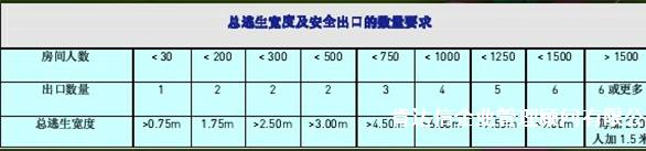 倉庫),其出口較小是可以接受的。表2.2列出了按照建筑物內的人數所需的出口的數量及總逃生