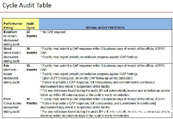 所有生產Jcpenney品牌和/或獨家品牌商品的工廠,或以Jcpenney作為進口商生產的工廠都必須接受社會責任審核。