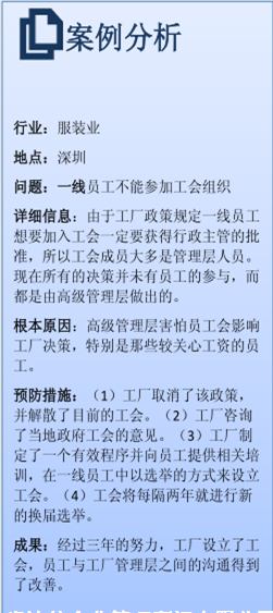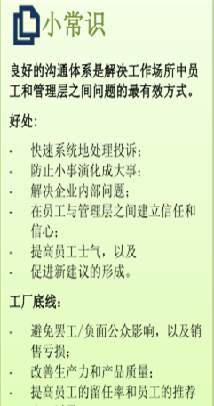 工廠定期與工會領(lǐng)導(dǎo)和/或員工代表開展非正式或正式會議,了解員工的擔(dān)憂。每次會議記錄存檔保留并張貼,讓員工閱讀了解。